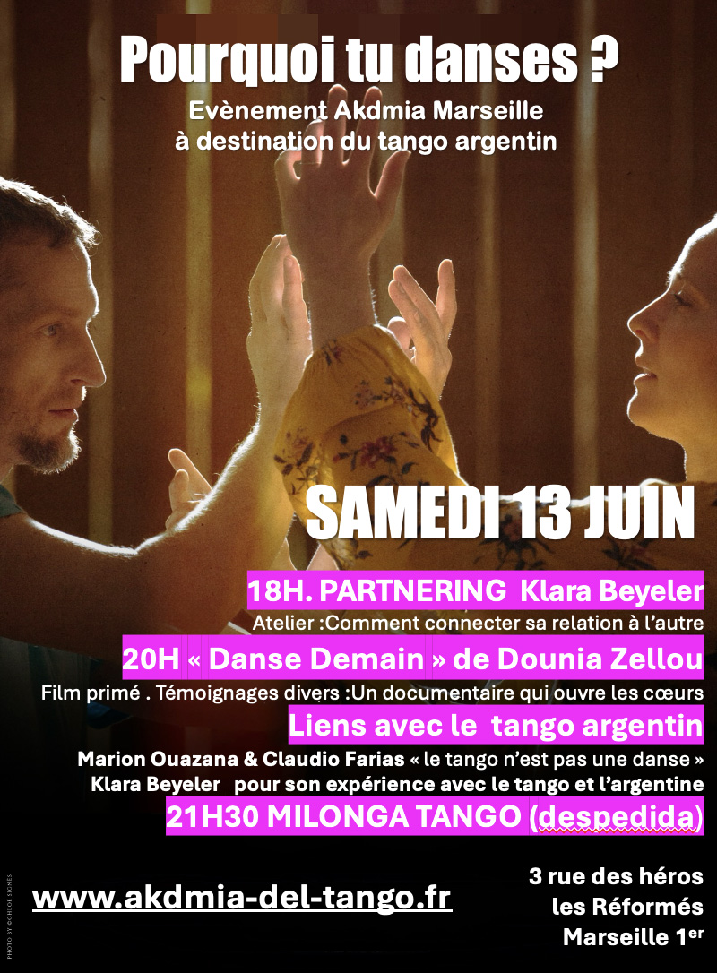 Sacrée ou spirituelle dans l’antiquité pour honorer les dieux ou pour célébrer des événements (cérémonie – récolte – préparation à la guerre) la danse va devenir un moyen de socialisation pour unir et divertir les peuples. En découvrant le documentaire DANSE DEMAIN de Dounia Zellou l’AKDmia a eu envie de se poser la question et de la rattacher au Tango Argentin.